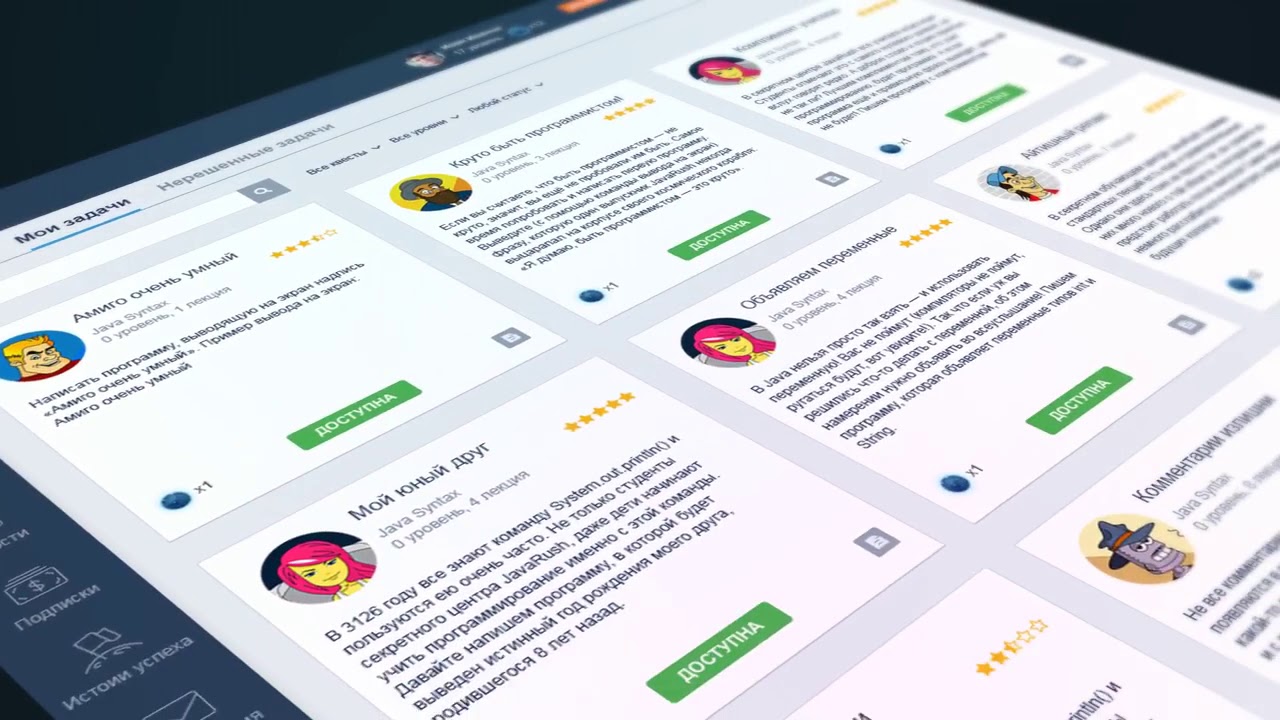 Прокачка вас как программиста. Это не просто Java уроки для начинающих — это возможность закрепить полученные знания на практике "здесь и сейчас". Вы читаете короткие лекции, затем там же решаете задачку и получаете за это вознаграждение. Это логично и понятно. Задачи вы будете решать самые разнообразные. Самые распространённые задания — написание кода для решения какой-то проблемы. Но кроме них, вам нужно будет учиться читать чужой код, исправлять в нём ошибки, улучшать его (рефакторинг), добавлять новые фичи.