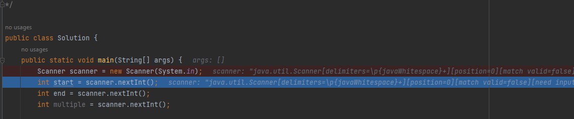 Дебаг включаю на сканнере, потому что дальше не пустит, выдает вот это, а потом на следующем шаге начинается бесконечная работа проги. Полный код ща прикреплю. (ну сам код задачи неважен, так на всех происходит, на рабочих, нерабочих, на всех короче).